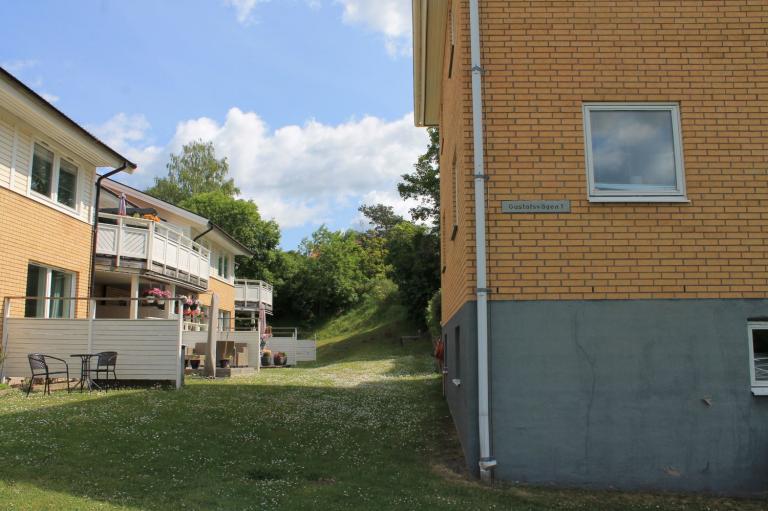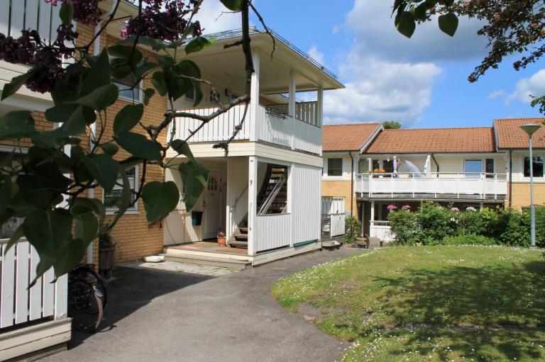 Området består av två huskroppar med en mysig och lummig innergård. Husen har två våningar där varje lägenhet har egen ingång och balkong/uteplats vilket skapar ett radhusliknande område.